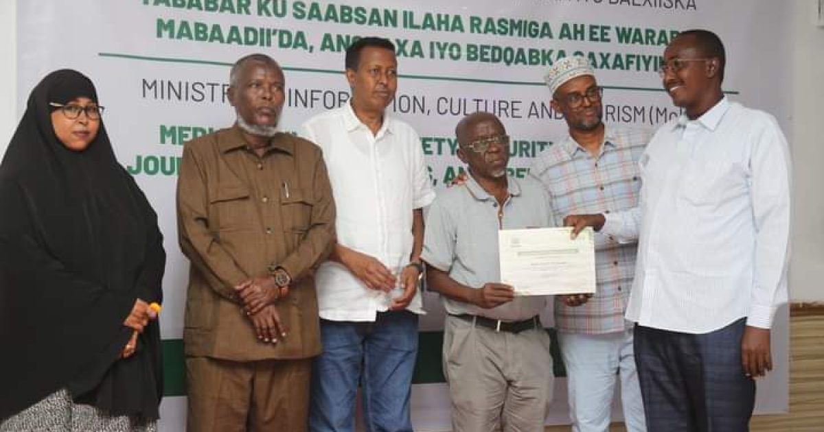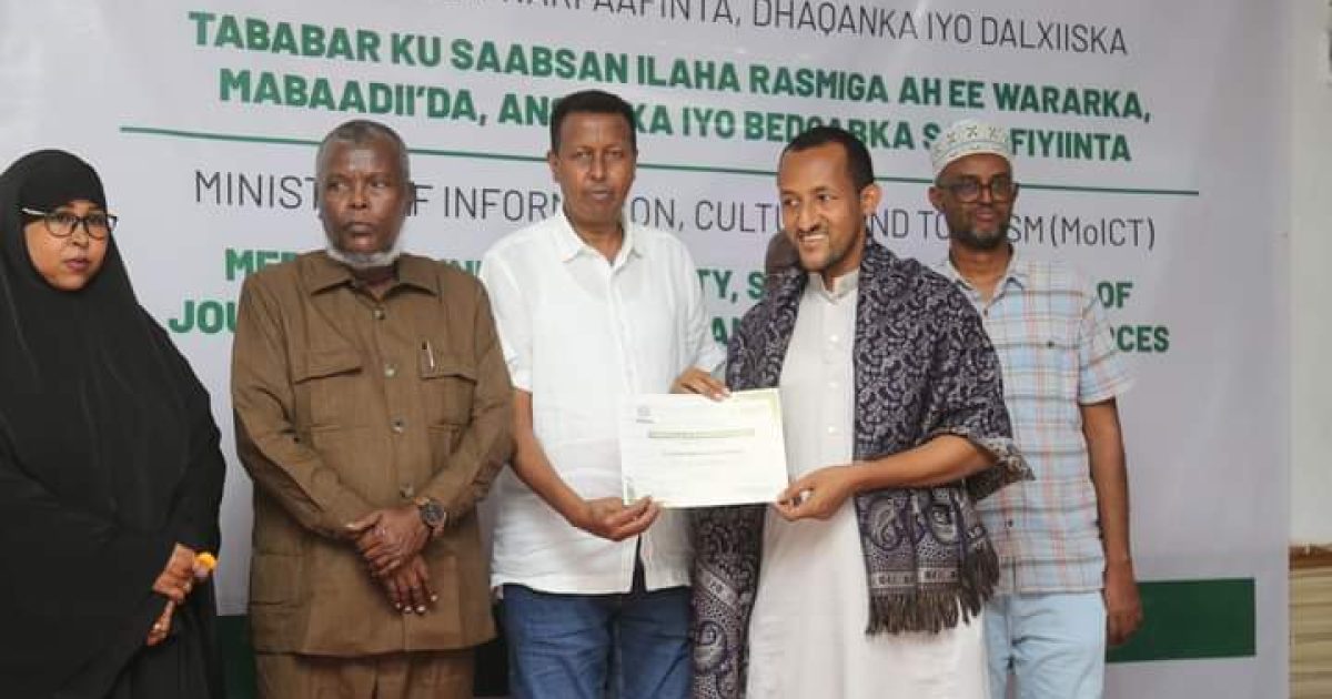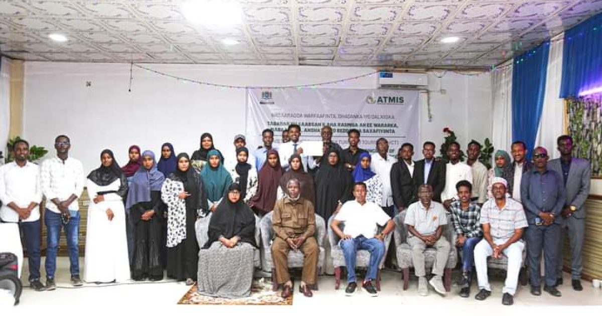 Agaasimaha guud ee Wasaaradda Warfaafinta, Dhaqanka iyo Dalxiiska JFS Mudane Cabdullaahi Xayir oo soo xiray aqoon isweydaarsiga ayaa uga mahad celiyay macaliinta bixinayay casharada iyo hawlgalka Midowga Afrika ee ATMIS oo Wasaaradda ka taageeray qabsoomidda tababarka.