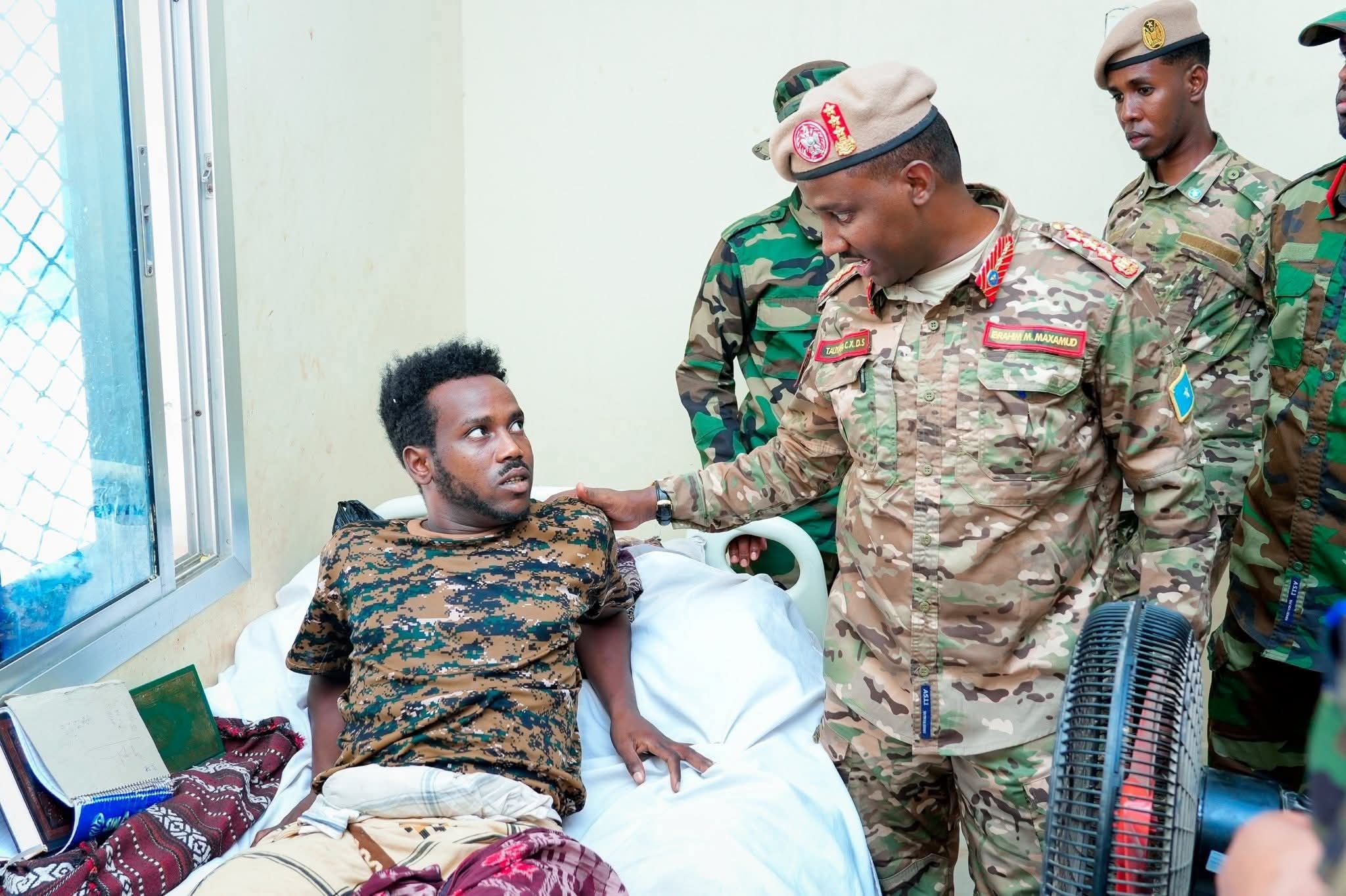 Taliyaha Ciidanka Xoogga Dalka Soomaaliyeed, S/Guuto Ibraahim Maxamed Maxamuud, ayaa booqasho ugu tegay askartii ku soo dhaawacantay dagaallada ka dhanka ah Khawaarijta, kuwaas oo lagu dabiibayo qaar ka mid ah isbitaallada ku yaalla Muqdisho.