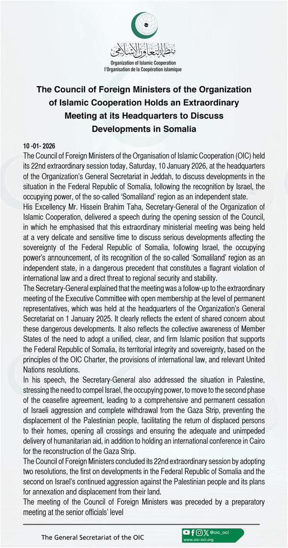The Council of Foreign Ministers of the Organization of Islamic Cooperation (OIC) held its 22nd extraordinary session today, Saturday, 10 January 2026, at the headquarters of the Organization’s General Secretariat in Jeddah, to discuss developments in the situation in the Federal Republic of Somalia, following the recognition by Israel, the occupying power, of the so-called “Somaliland” region as an independent state.