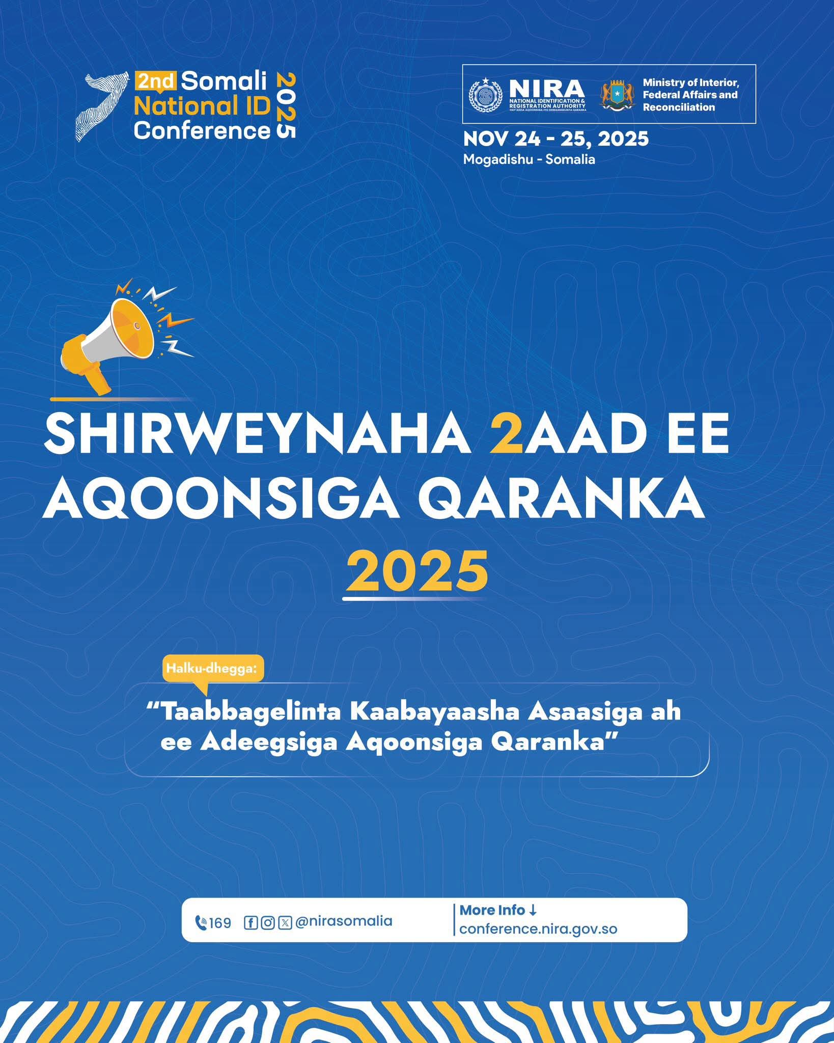 1. Shirweynaha 2aad ee Aqoonsiga Qaranka Soomaaliya ee ay qabatay Hay’adda Aqoonsiga iyo Diiwaangelinta Qaranka (NIRA) ayaa lagu qabtay Muqdisho 24–25 Noofembar. Waxaa si rasmi ah u soo xiray Madaxweynaha Soomaaliya, Xasan Sheekh Maxamuud, waxaana furay Ra’iisul Wasaaraha Xukuumadda Federaalka, Xamsa Cabdi Barre. Waxaa ka qayb galay madaxda sare ee Dowladda, Dowlad Goboleedyada, Maamulka Gobolka Banaadir, safiiro, saaxiibada caalamiga ah, bulshada rayidka, jaamacadaha, ganacsatada, iyo warbaahinta.