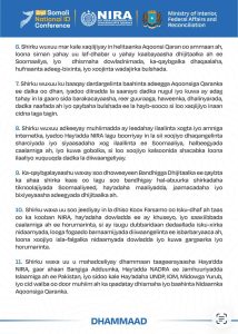 11.Waxaa la mahadceliyay dhammaan taageerayaashii hirgelinta nidaamka aqoonsiga, gaar ahaan hay’adaha caalamiga ah sida Bangiga Adduunka, NADRA, UNDP, IOM iwm.
