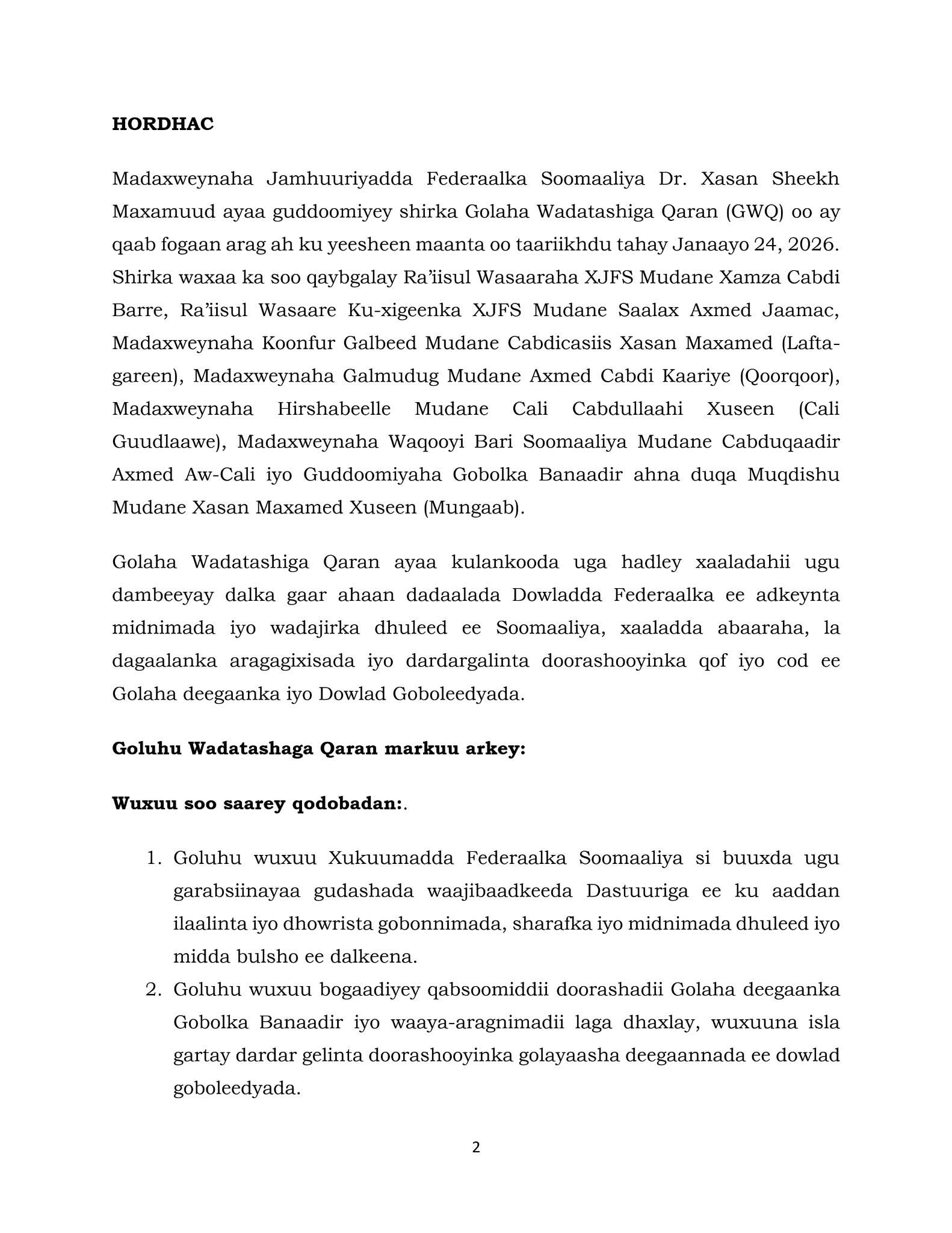 3. Goluhu wuxuu soo dhaweynayaa ayidaada Golaha Mustaqabalka ee casuumadii gogosha wadatashiga Qaran ee ay ku baaqday Xukuumadda 1-da Febraayo 2026.