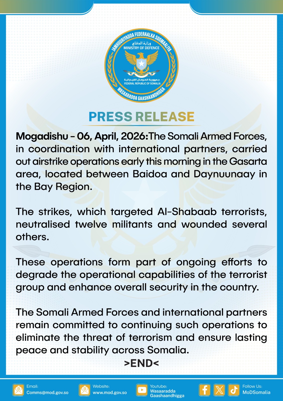 Ciidanka Qaranka, oo kaashanaya saaxiibbada caalamka, ayaa aroornimadii maanta fuliyay hawlgallo duqeymo ah oo ka dhacay deegaanka Gasarta, oo u dhexeeya Baydhabo iyo Daynuunaay ee gobolka Baay.