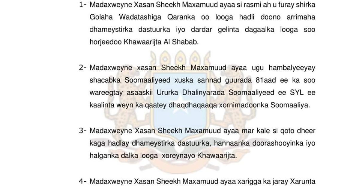 1- Madaxweyne Xasan Sheekh Maxamuud ayaa si rasmi ah u furay shirka Golaha Wadatashiga Qaranka oo looga hadli doono arrimaha dhameystirka dastuurka iyo dardar gelinta dagaalka looga soo horjeedoo Khawaarijta Al Shabab.