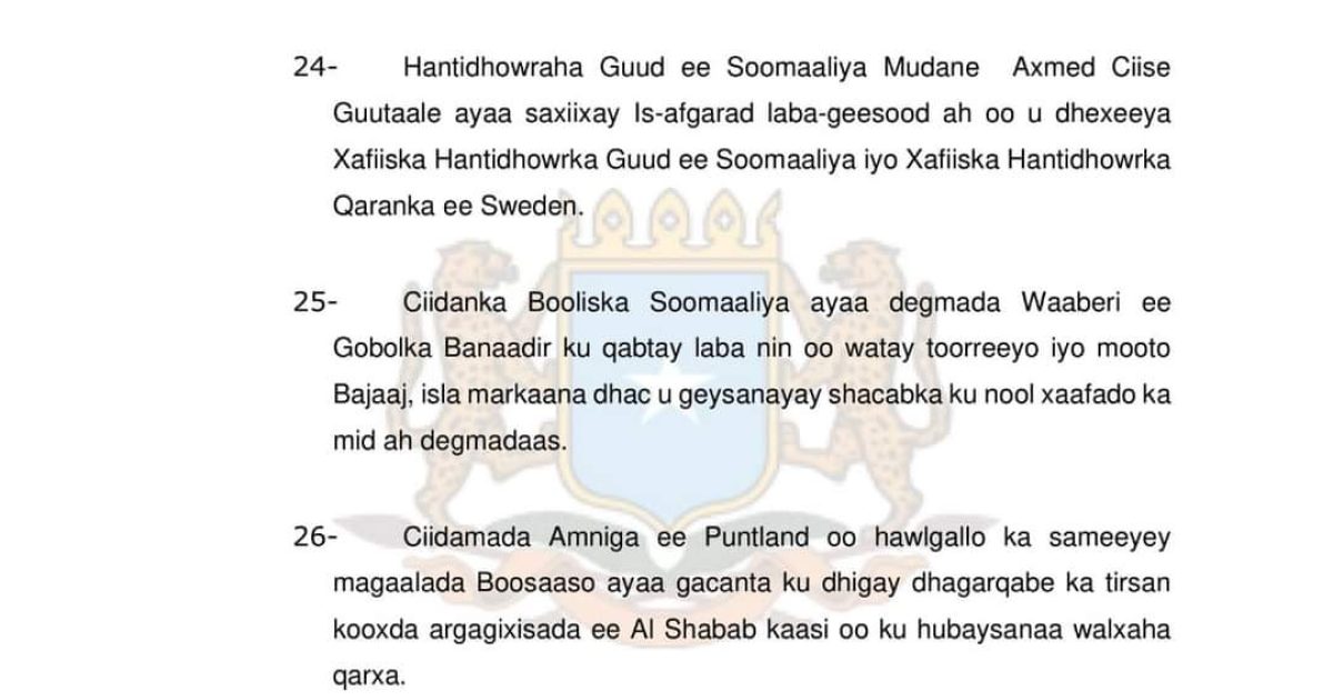 24- Hantidhowraha Guud ee Soomaaliya Mudane Axmed Ciise Guutaale ayaa saxiixay Is-afgarad laba-geesood ah oo u dhexeeya Xafiiska Hantidhowrka Guud ee Soomaaliya iyo Xafiiska Hantidhowrka Qaranka ee Sweden.