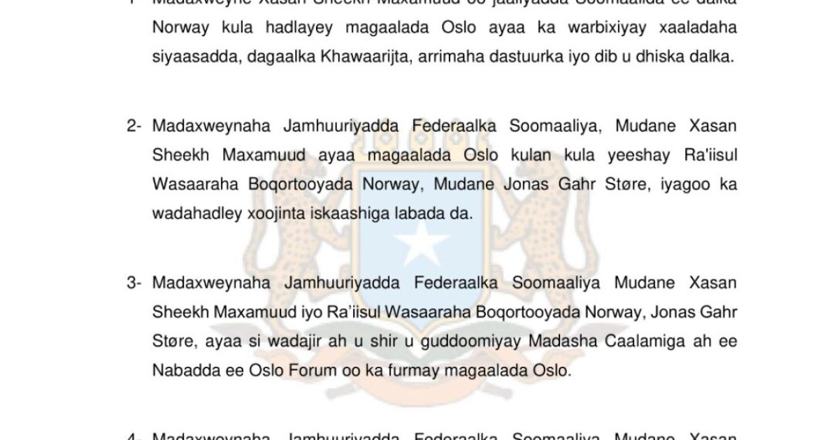 2- Madaxweynaha Jamhuuriyadda Federaalka Soomaaliya, Mudane Xasan Sheekh Maxamuud, ayaa magaalada Oslo kulan kula yeeshay Ra’iisul Wasaaraha Boqortooyada Norway, Mudane Jonas Gahr Støre, iyagoo ka wadahadley xoojinta iskaashiga labada da.