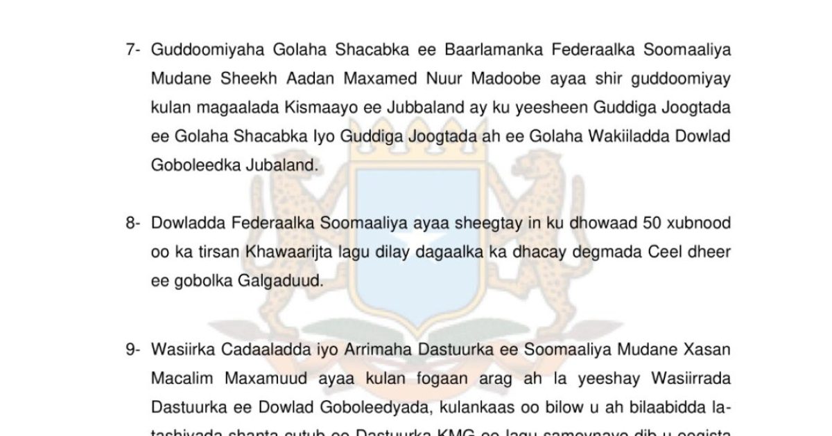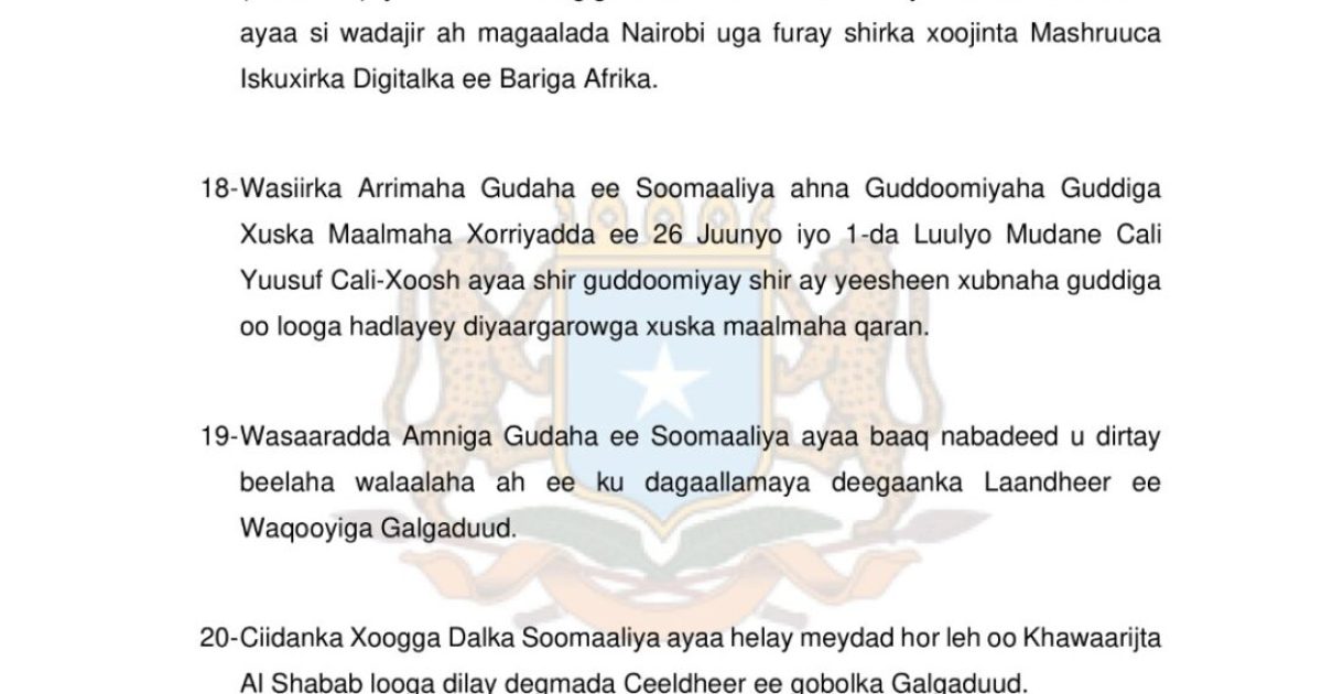 19- Wasaaradda Amniga Gudaha ee Soomaaliya ayaa baaq nabadeed u dirtay beelaha walaalaha ah ee ku dagaallamaya deegaanka Laandheer ee Waqooyiga Galgaduud.