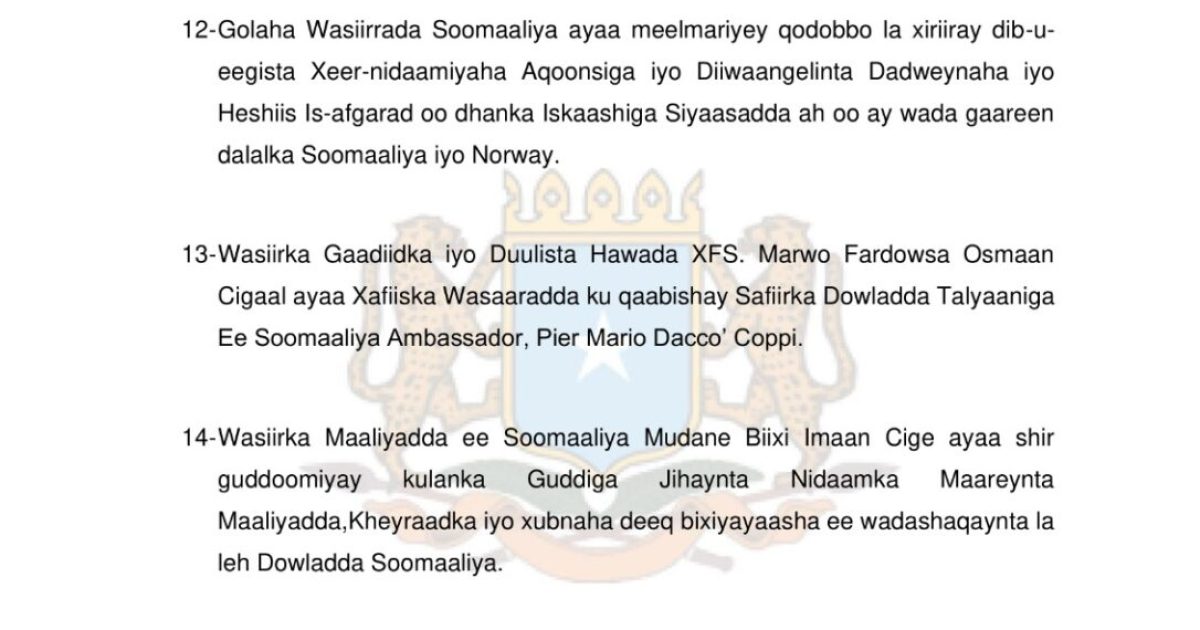 12- Golaha Wasiirrada Soomaaliya ayaa meelmariyey qodobbo la xiriiray dib-u-eegista Xeer-nidaamiyaha Aqoonsiga iyo Diiwaangelinta Dadweynaha iyo Heshiis Is-afgarad oo dhanka Iskaashiga Siyaasadda ah oo ay wada gaareen dalalka Soomaaliya iyo Norway.