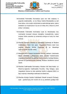 19- Dowladda Federaalka Soomaaliya ayaa ku dhawaaqday inay mudnaanta koowaad siinayso bedqabka muwaadiniinta, iyadoo xoojisay fulinta xeerarka iyo amarrada amniga ee horay loo meel mariyay.