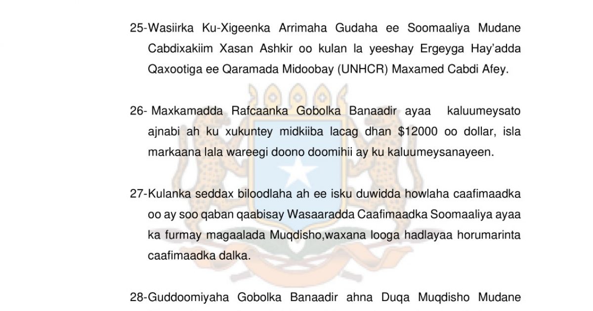 26- Maxkamadda Rafcaanka Gobolka Banaadir ayaa kaluumeysato ajnabi ah ku xukuntey midkiiba lacag dhan $12000 oo dollar, isla markaana lala wareegi doono doomihii ay ku kaluumeysanayeen.