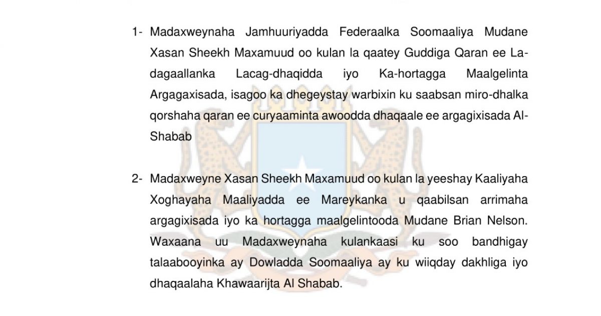 2-Madaxweyne Xasan Sheekh Maxamuud oo kulan la yeeshay Kaaliyaha Xoghayaha Maaliyadda ee Mareykanka u qaabilsan arrimaha argagixisada iyo ka hortagga maalgelintooda Mudane Brian Nelson. Waxaana uu Madaxweynaha kulankaasi ku soo bandhigay talaabooyinka ay Dowladda Soomaaliya ay ku wiiqday dakhliga iyo dhaqaalaha Khawaarijta Al Shabab.