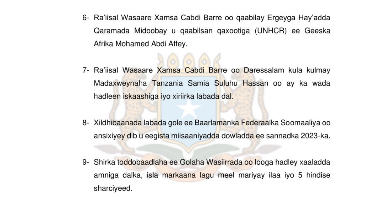 5-Ra’iisul Wasaare Xamsa Cabdi Barre oo madaxweynaha Kenya William Ruto kala hadlay in muwaadiniinta Soomaaliyeed loo fududeeyo dal ku galka Kenya iyo ciribtirka Khawaariijta, kadib kulan ka dhacay magaalada Daressalam ee dalka Tanzania.