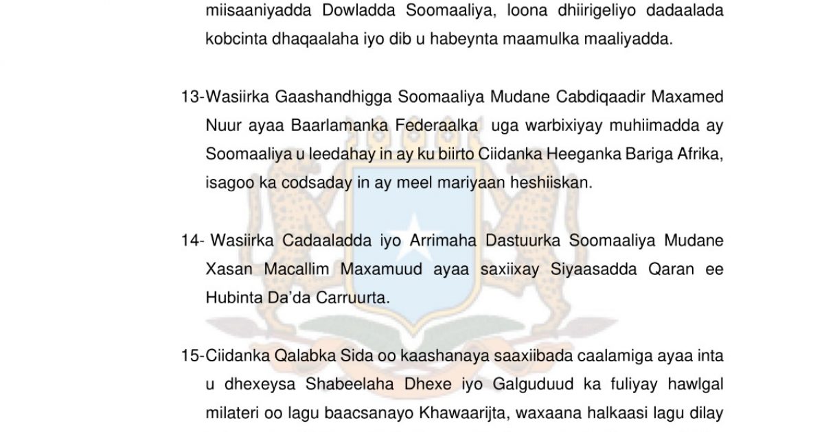 13-Wasiirka Gaashandhigga Soomaaliya Mudane Cabdiqaadir Maxamed Nuur ayaa Baarlamanka Federaalka uga warbixiyay muhiimadda ay Soomaaliya u leedahay in ay ku biirto Ciidanka Heeganka Bariga Afrika, isagoo ka codsaday in ay meel mariyaan heshiiskan.