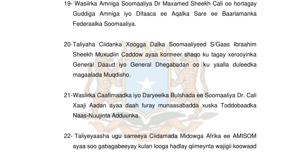 9-Shirka toddobaadlaha ee Golaha Wasiirrada oo looga hadley xaaladda amniga dalka, isla markaana lagu meel mariyay ilaa iyo 5 hindise sharciyeed.