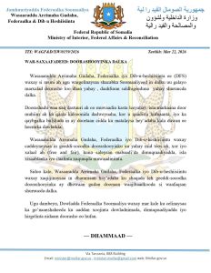 RADIO MUQDISHO:-Wasaaaradda Arrimaha Gudaha, Federaalka iyo Dib-u-heshiistinta ee (DFS) waxay si rasmi ah ugu wargelinaysaa shacabka Soomaaliyeed in dalku uu...