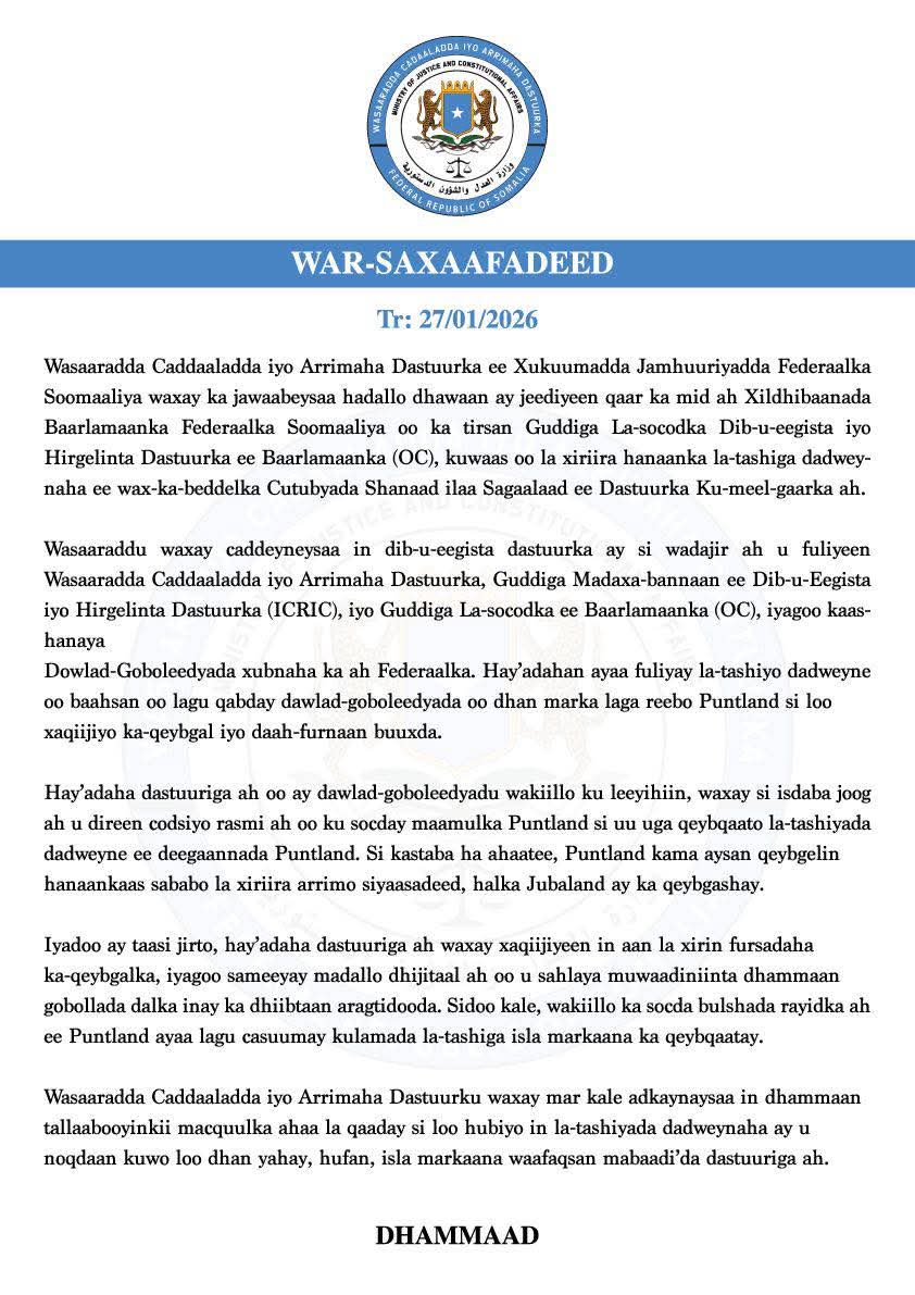Wasaaradda Caddaaladda iyo Arrimaha Dastuurka ee Xukuumadda Jamhuuriyadda Federaalka Soomaaliya waxay ka jawaabeysaa hadallo dhawaan ay jeediyeen qaar ka mid ah Xildhibaannada Baarlamaanka Federaalka Soomaaliya oo ka tirsan Guddiga La-socodka Dib-u-eegista iyo Hirgelinta Dastuurka ee Baarlamaanka (OC), kuwaas oo la xiriira hannaanka la-tashiga dadweynaha ee wax-ka-beddelka Cutubyada Shanaad ilaa Sagaalaad ee Dastuurka Ku-meel-gaarka ah.