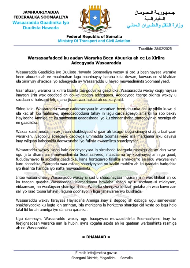 Wasaaradda Gaadiidka iyo Duulista Hawada Soomaaliya waxay si cad u beeninaysaa wararka been abuurka ah ee maalmahan lagu baahinayay baraha kala duwan, kuwaas oo si khaldan ula xiriiriyay shaqada iyo adeegyada ay Wasaaraddu u hayso muwaadiniinta Soomaaliyeed.