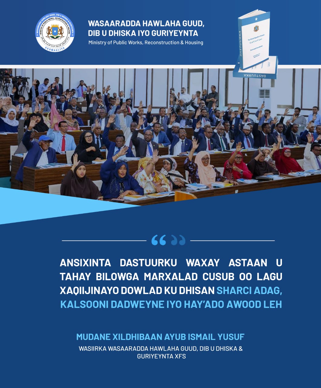 “Ansixinta dastuurku waxay astaan u tahay bilowga marxalad cusub oo lagu xaqiijinayo dowlad ku dhisan sharci adag, kalsooni dadweyne iyo hay’ado awood leh,” ayuu yiri Ayub Ismail Yusuf, Wasiirka Wasaaradda Hawlaha Guud, Dib-u-dhiska iyo Guriyeynta XFS.