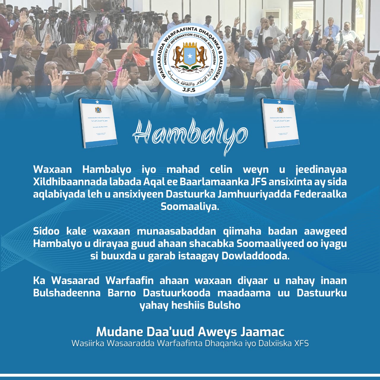 Wasaaradda Warfaafinta, Dhaqanka iyo Dalxiiska Soomaaliya ayaa si diirran u soo dhoweysay ansixinta ay Baarlamaanka Federaalka Soomaaliya ku meel mariyeen dhammaystirka Dastuurka Jamhuuriyadda Federaalka Soomaaliya.