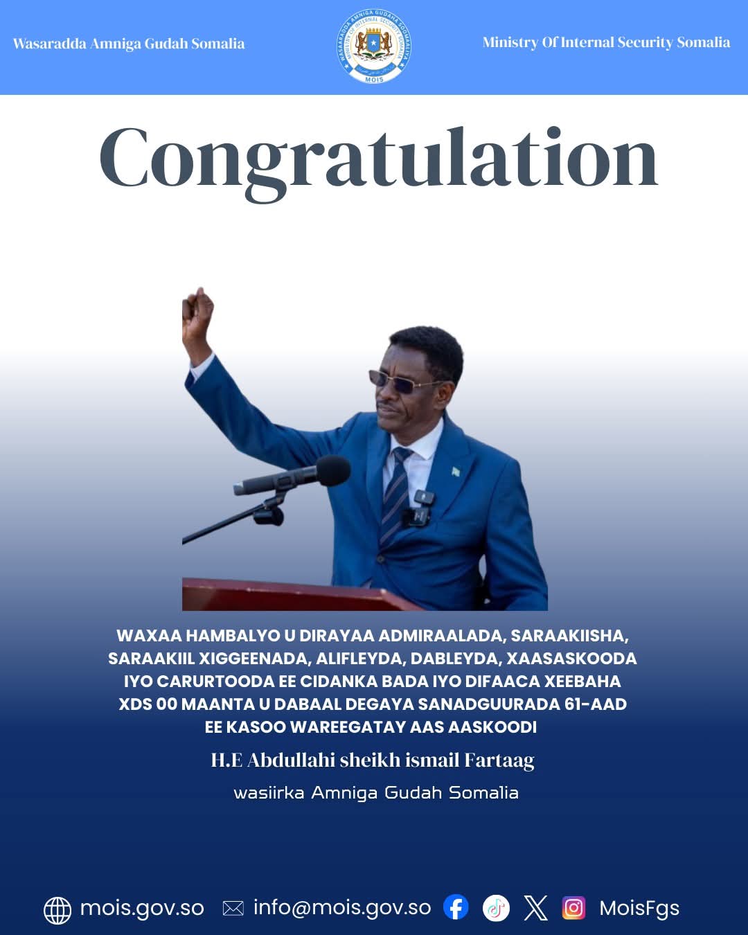 “Waxaan hambalyo u dirayaa Admiraallada, Saraakiisha, Saraakiil-xigeennada, Alifleyda, Dableyda, iyo dhammaan xubnaha Ciidanka Badda iyo Difaaca Xeebaha XDS, sidoo kale xaasaskooda iyo carruurtooda, munaasabadda sannad-guurada 61-aad ee aasaaska Ciidankan sharafta leh.”