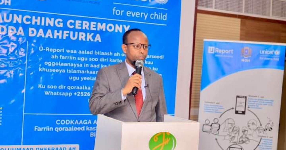 Wasiirka Wasaaradda Caafmaadka iyo daryeelka bulshadda Xukuumadda Federaalka Soomaaliya Dr. Cali Xaaji Aadam ayaa daahfuray xafladda Aladda U Report oo macnaheedu yahay ‘’Codkaaga kor uqaad’’ kaas oo ah hab sahlaya in si fudud lagu soo gudbiyo fariimaha muhiimka ah ee ka imaanaya bulshada qeybaheeda kala duwan, awoodna usiinaya shaqaalaha wacyi gellinta in ay helaan soona gudbiyaan xog sax ah.