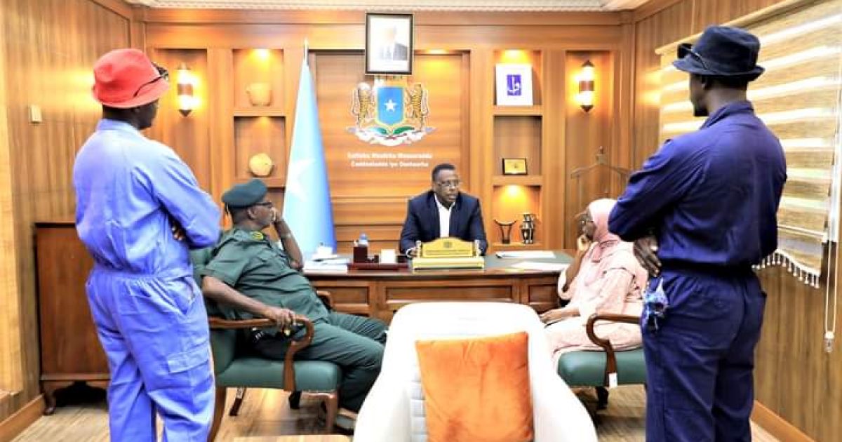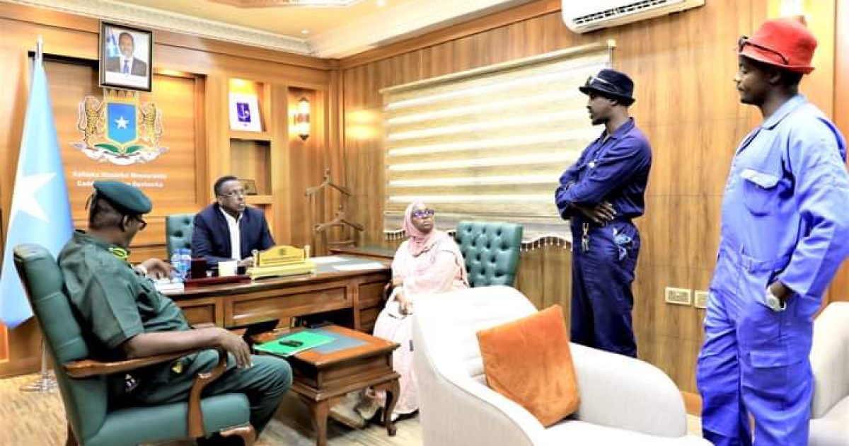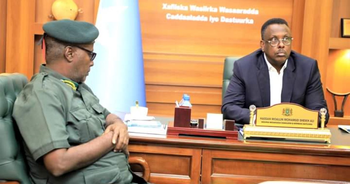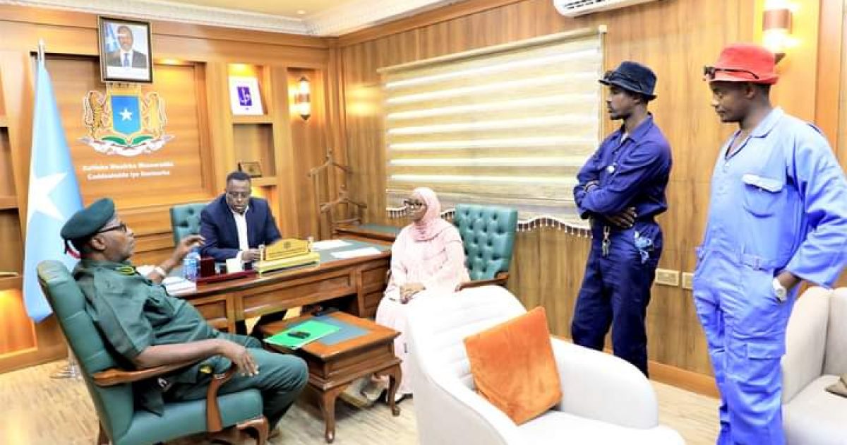 Wasiirka Wasaarada Cadaalada iyo Arrimaha Dastuurka Xukuumadda Federaalka Soomaaliya mudane Xasan Macalin Maxamuud ayaa xafiiskiisa ku qaabilay Taliyaha Xabsiga Dhexe ee Muqdisho Janaraal Daahir oo ay weheliyaan laba muwaadin (maxbuus) oo xukunkoodu dhammaanayo dhawaan.