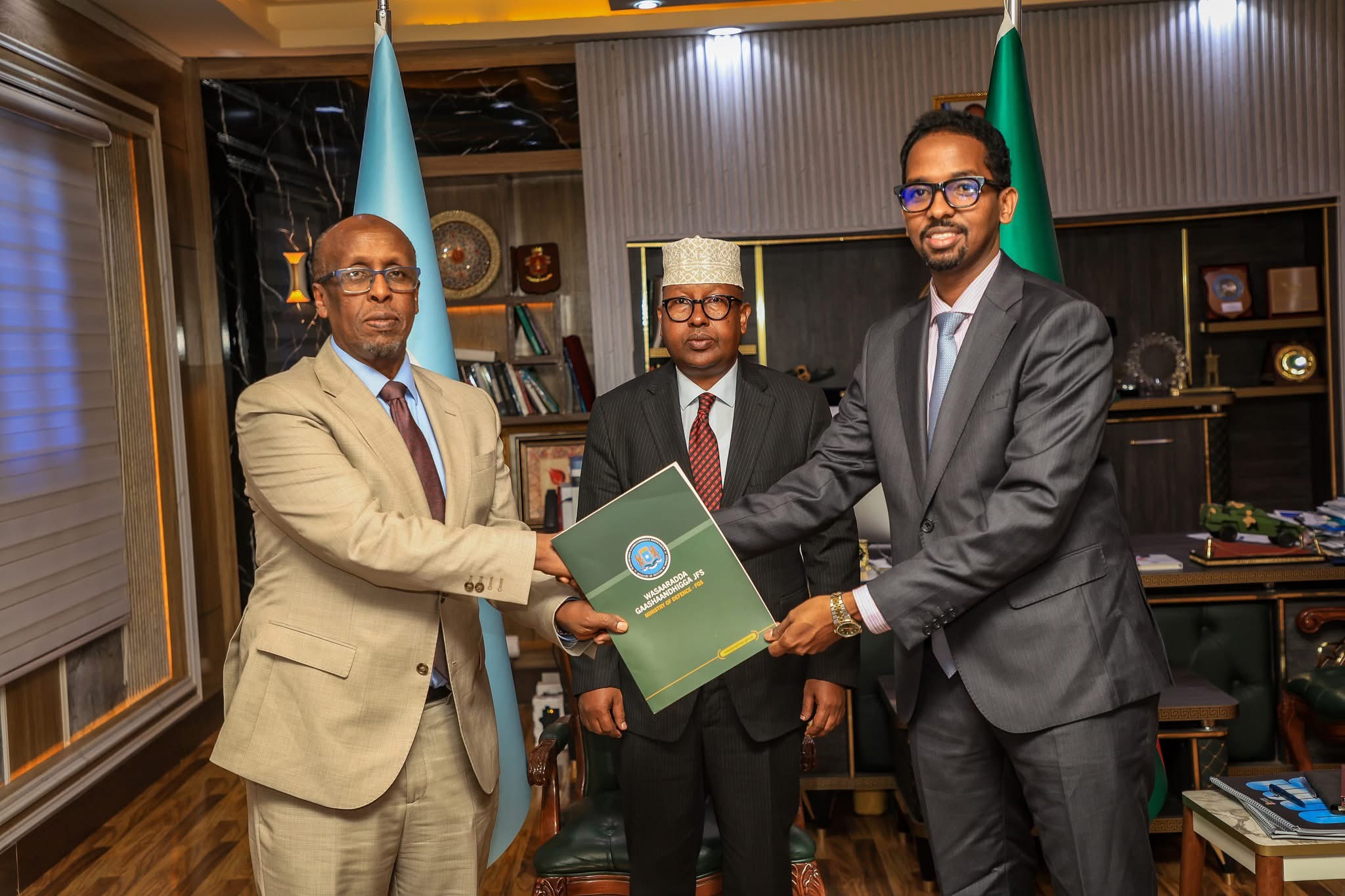RADIO MUQDISHO:-Wasiirka Gaashaandhigga, Mudane Axmed Macallin Fiqi, ayaa maanta xilka u kala wareejiyey Xoghayaha cusub ee Wasaaradda, Mudane Yuusuf Cali Maxamed, iyo Xoghayihii hore, Mudane Cabdifataax Cabdulqaadir Faarax.