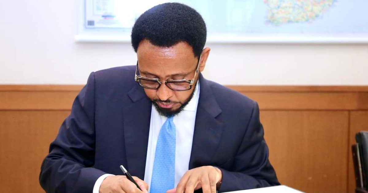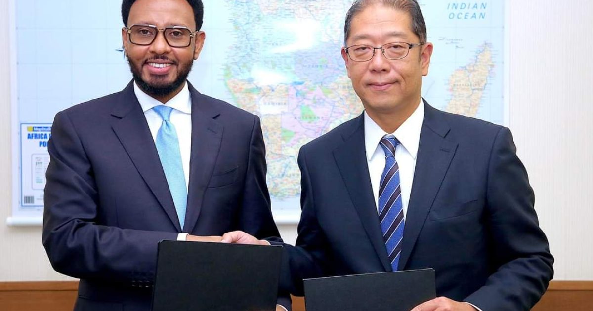 Wasiirka Maaliyadda Xukuumadda Federaalka Soomaaliya Mudane Biixi Imaan Cige iyo Safiirka Dowladda Japan ee Dalka Kenya Mr. OGIHARA Hiroshi, ayaa maanta si wadajir ah u saxiixay heshiis Dowladda Japan ay ku cafinayso lacag dhan 14-Bilyan oo lacagta Japan ah, doolar ahaan u dhiganta in ka badan Boqol Milyan oo Doolar.