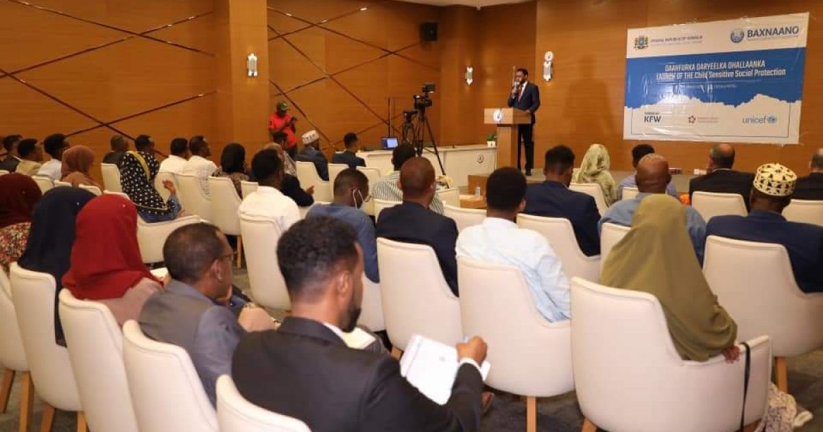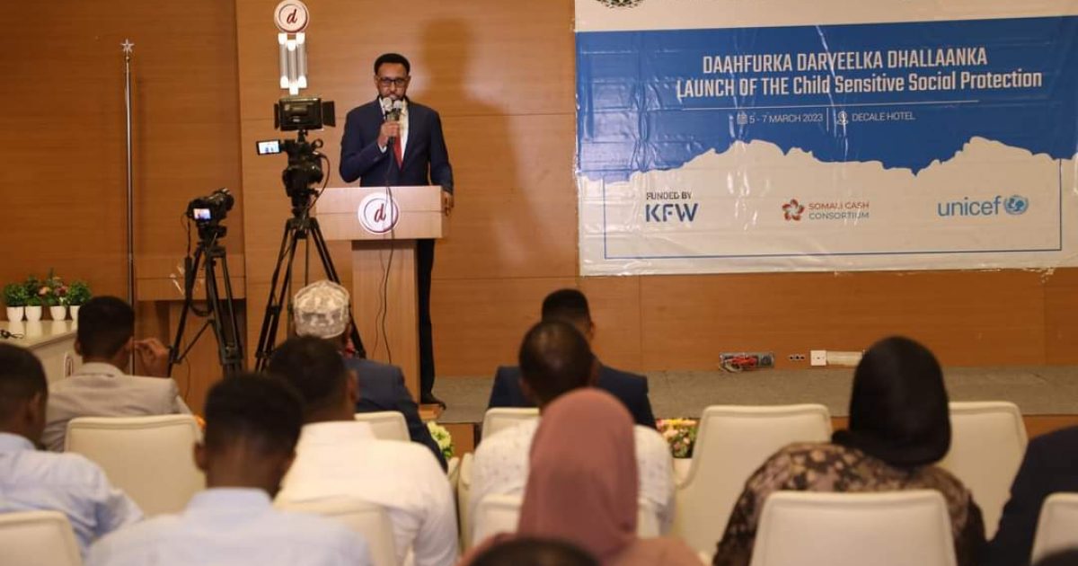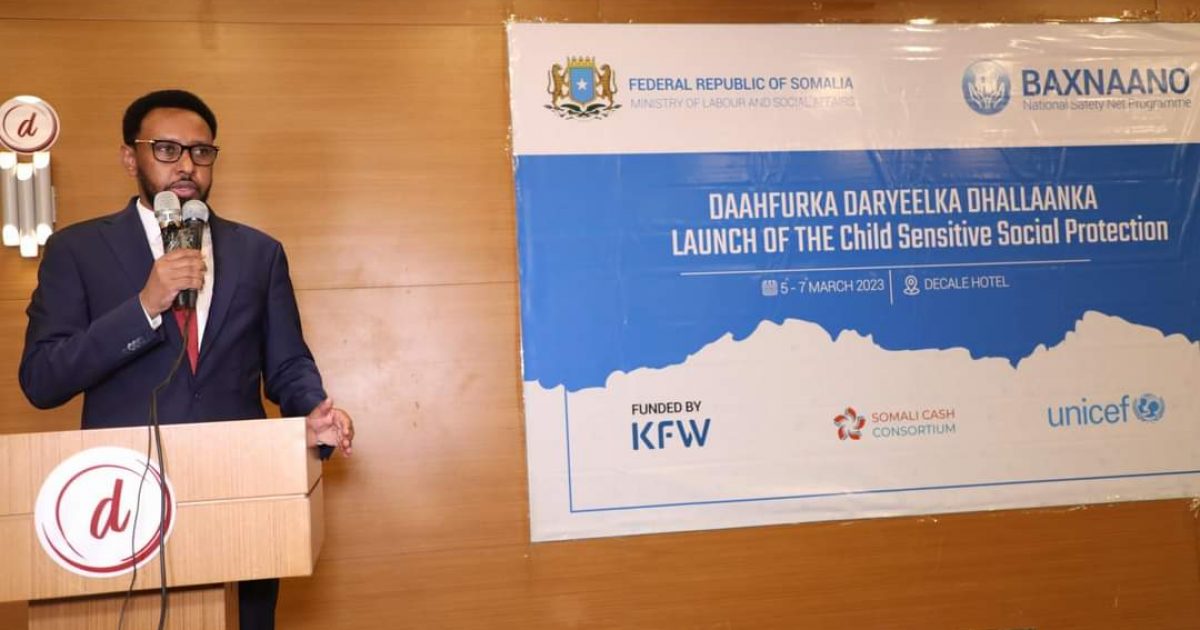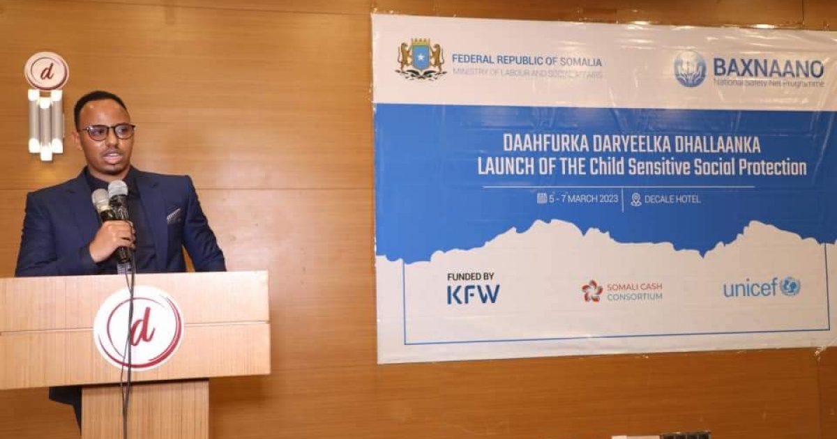 Wasiirka Shaqada iyo Arrimaha Bulshada Xukuumadda Federaalka Soomaaliya,Mudane Biixi Iimaan Cige ayaa maanta daahfuray mashruuca Daryeelka Dhallaanka ,iyadoo ay munaasabadda goobjoog u ahaayeen Wasiirro ka tirsan Xukuumadda Federaalka Soomaaliya, Dawlad-gobolleedyada, Xildhibaannada Federaalka, wakiillada hay’adaha Dawladda, UNICEF, Dallada Somalia Cash Consortium iyo marti kale.