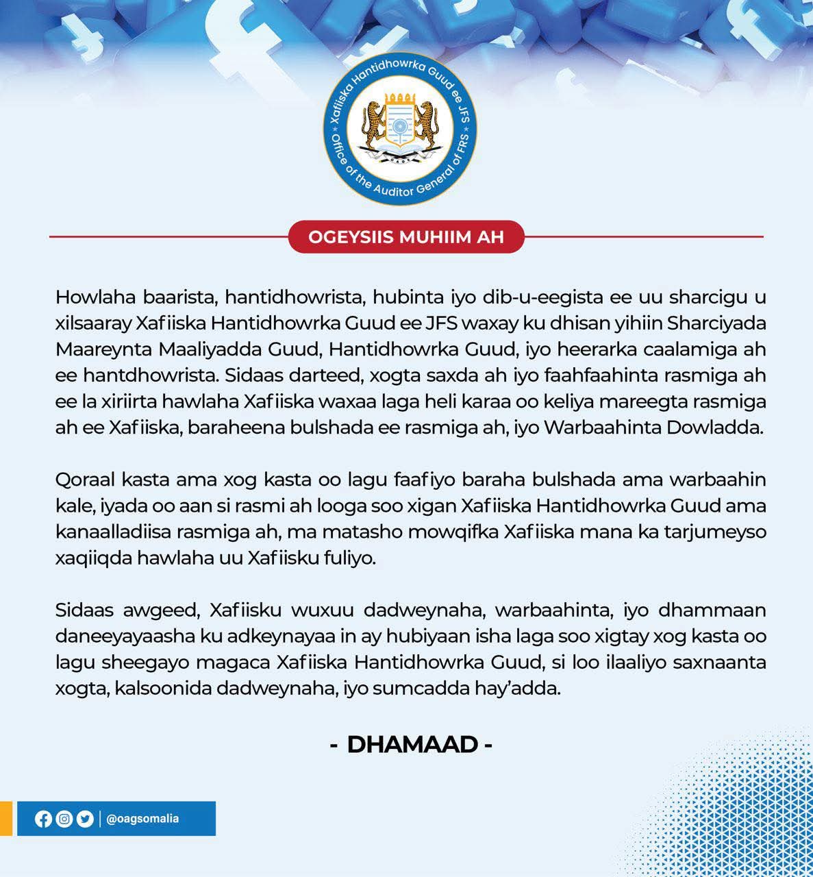 Xafiiska Hantidhowrka Guud ee JFS waxa uu dadweynaha ku wargelinayaa in xogta rasmiga ah ee la xiriirta howlaha baarista, hantidhowrista, hubinta iyo dib-u-eegista ee Xafiiska ay ka helikaraan oo keliya mareegta rasmiga ah ee Xafiiska, baraha bulshada ee rasmiga ah, iyo Warbaahinta Dowladda.